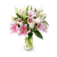 Más DetallesHermoso arreglo de una docena de lirios rosas o stargazers en florero